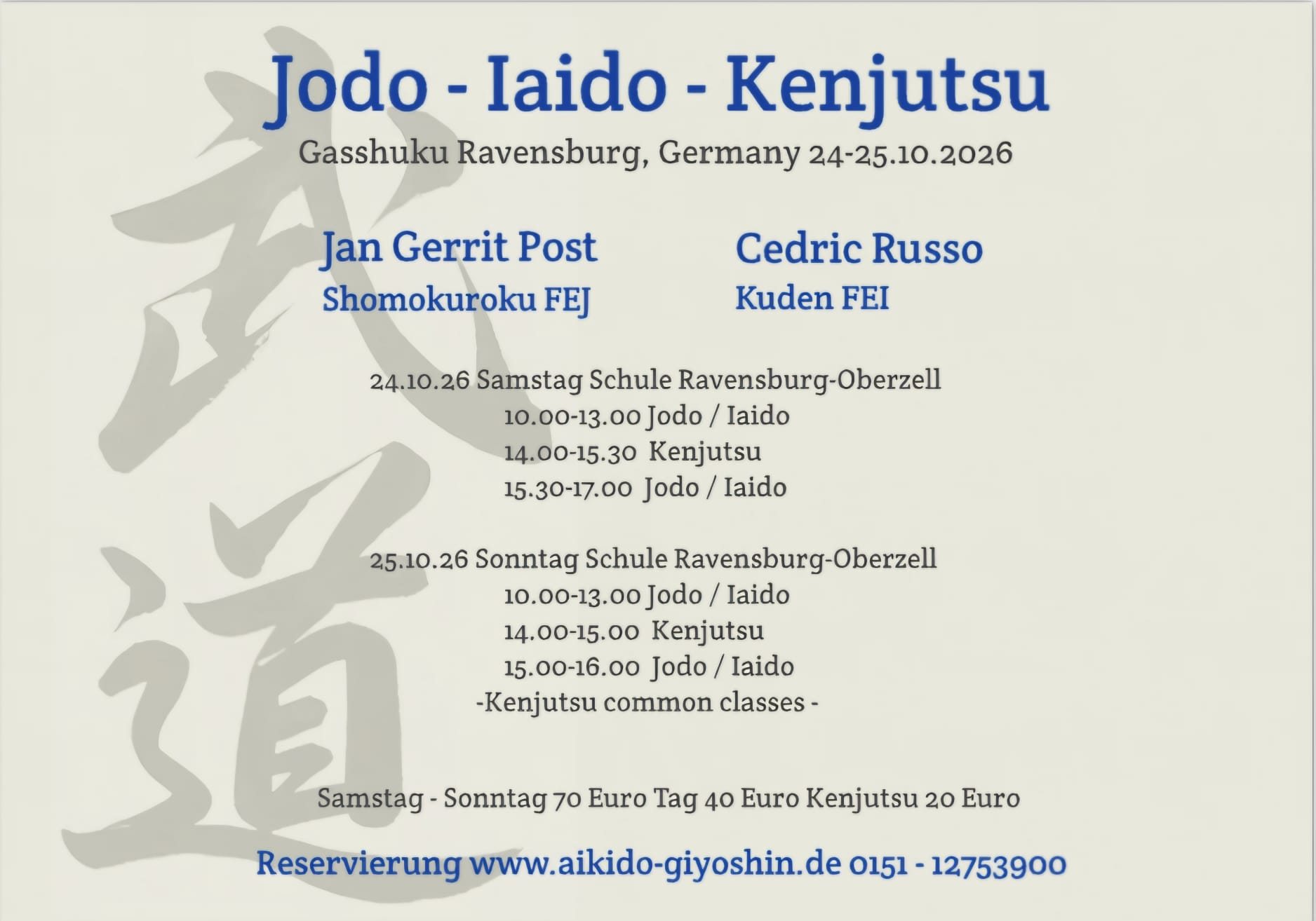 | Stage Iaido-Jodo Jan Gerit Cédric Russo | Oberzell / DE | 24-25.10.2026 | Affiche |